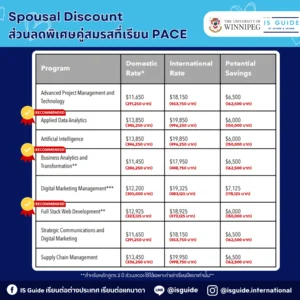 1. คู่สมรส (Spouse) เรียน PACE Program → จ่ายค่าเทอม Domestic Rate (ประหยัดสูงสุดกว่า 6,500 CAD – 162,500 บาท)