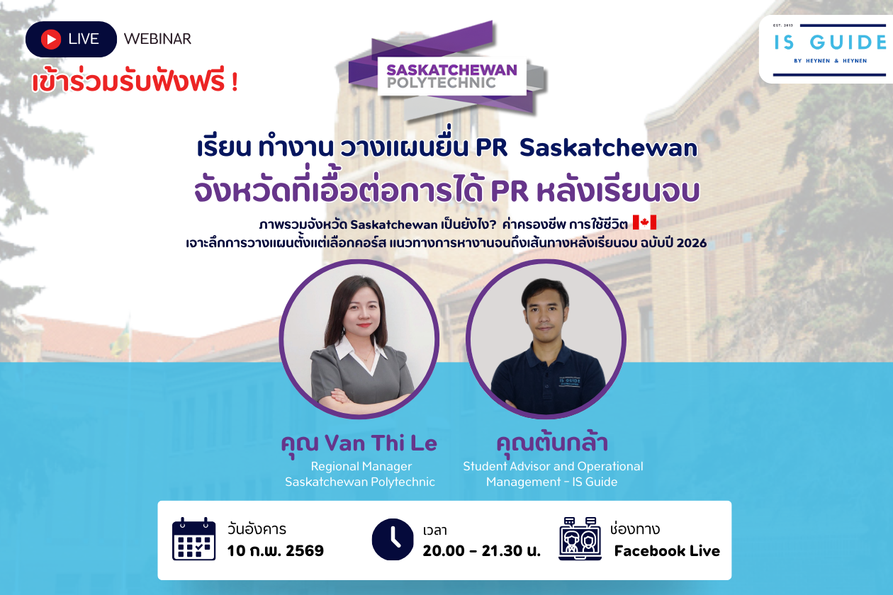จังหวัด Saskatchewan เอื้อต่อการยื่นขอ PR หลังเรียนจบ เลือกโปรแกรมยังไงเหมาะกับเรา ฉบับปี 2026 มาพูดคุย เจาะแนวคิดการวางแผนตั้งแต่เลือกคอร์ส แนวทางการหางานจนถึงเส้นทางหลังเรียนจบ พบกับคุณ Van Thi Le เจ้าหน้าที่ Regional Manager จาก...